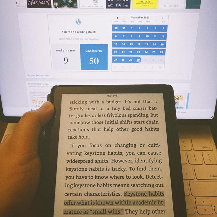 Still trying to achieve my 2022 Reading Goal - Iām nine books away from completing that goal (22 books) - I have two ongoing reads right now and seven I have yet to start. Iām still positive I can do this. I also got the complete month achievement on the Kindle app - Iām proud of that reading streak!
